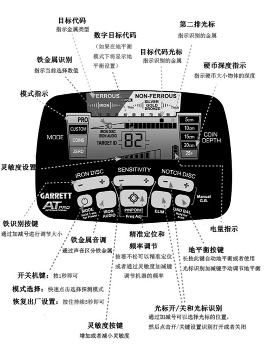 3.IRON AUDIO(铁金属音调开关):按下或松开铁音频按钮,开启或关闭铁音频功能。功能启用时,显示屏显示“铁音频”字样。铁音频功能可用于AT-PRO的六种模式中的任一种。 地下散落的铁物件会屏蔽一些正确的目标物,甚至产生“鬼鸣”。美国盖瑞特特有的铁音频功能可以让操作者分辨出铁的声音(正常情况下为无声),从而避免误挖非想要的目标物。通过铁识别设定,铁金属的音频也可以调节包括所有目标在内的中音调范围。操作者可以通过设置关闭低音调的铁金属目标和中音调的目标,从而更好的识别有价值的目标。
